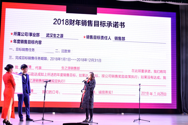 今年的年會與往年年會最大的不同為:增加了年度銷售目標承諾的環節。生之源各區域的銷售代表上臺,對2018年的銷售業績立下目標。言語之間,充滿了豪情壯志。